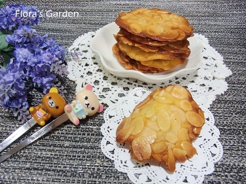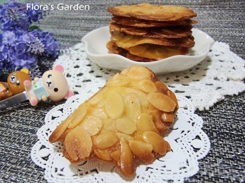 材料:蛋白40克;細白糖50克;融化奶油15克;低筋麵粉10克;香草醬1小匙;杏仁片100克(可做18片)