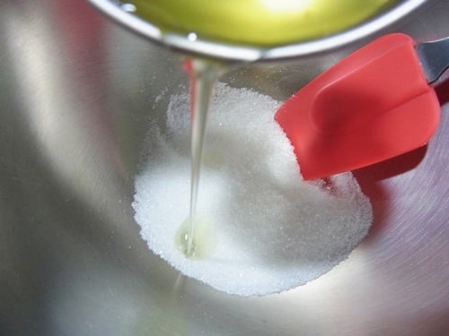 1.蛋白加入糖,用橡皮刮刀邊攪拌。