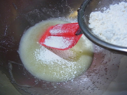 3.過篩低粉、拌勻,再加香草醬(或新鮮香草籽)拌勻。