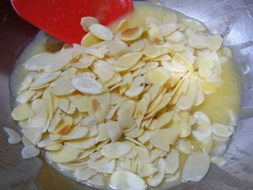 4.最後加入杏仁片,輕輕拌勻,保鮮膜包緊放冰箱冷藏12小時(趕時間就冷藏至少1.5小時)。
