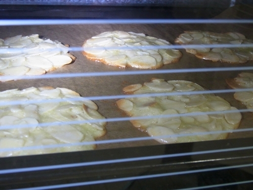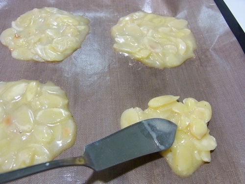 5.用湯匙舀一匙放不沾烘培紙上、推開成圓形,杏仁片不要重疊。
