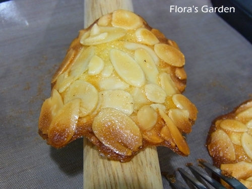 7.如果喜歡彎彎的造型,剛出爐趁熱用叉子輕輕搓起,放橄麵棍上輕壓就會彎曲。