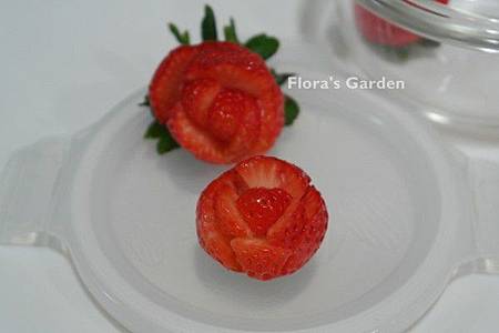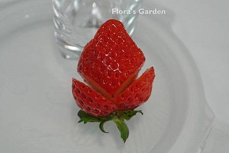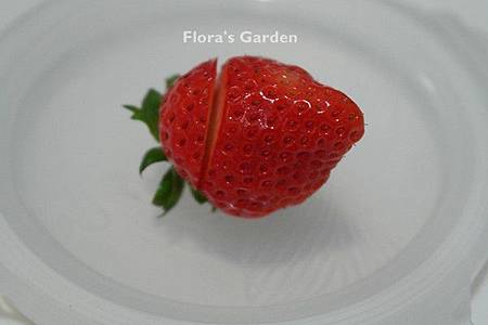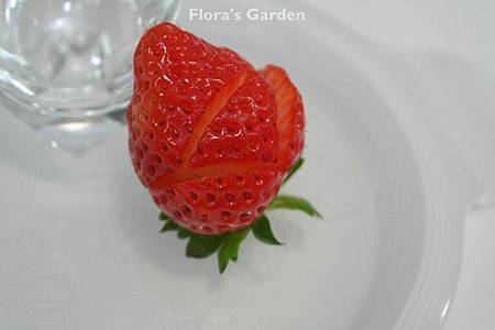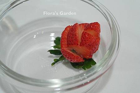 草莓洗淨、擦乾。 從底部三分之一處斜切一刀。