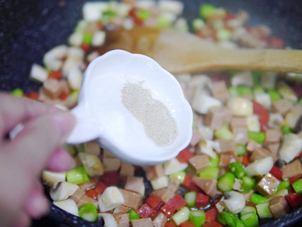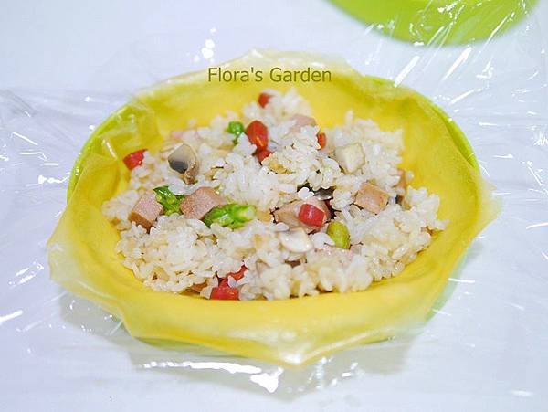加入一大碗白飯鋪在上層、淋些醬油,輕輕撥動白飯均勻裹上醬油,再和底層的配料一起拌炒均勻即完成Flora二段式調味法的炒飯。