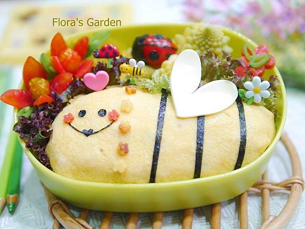 用牙籤在起司片上畫一個心型,取出當蜜蜂的翅膀(可用一小段細的義大利麵固定)。