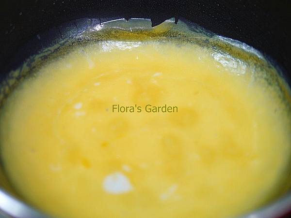 加熱到鍋子放濕抹布上會發出"滋~~"的聲音表示溫度夠,倒入蛋液(蛋1顆、鹽少許打散)、旋轉鍋子讓蛋液攤開鋪平,小火煎到蛋皮周圍微微掀開、用手輕輕拉起翻面即熄火,利用鍋子餘溫煎熟,即可煎出軟嫩蛋皮。