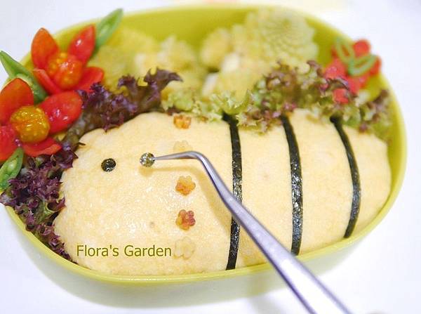 用剪刀剪海苔當蜜蜂身體的線條(海苔背面塗沙拉醬當黏著劑)