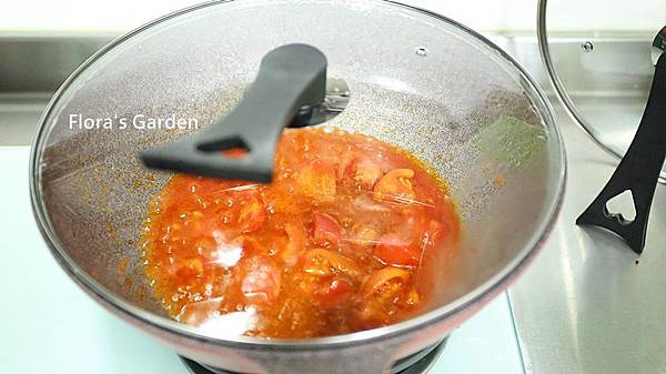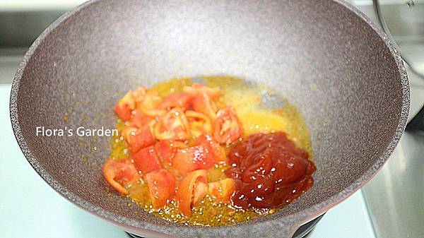 鍋中再次放油、番茄過熱水去皮、切塊放入鍋中炒到油變色(茄紅素釋出)、加番茄醬、鹽、糖拌炒一下