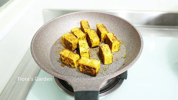 食材:傳貴有機豆腐1盒、咖哩粉2匙、辣椒粉1匙、薑黃粉1匙、黑胡椒粉1匙、砂糖1匙、醬油1匙、沙拉油2匙
