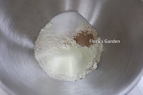 麵團:高筋麵粉300克、奶粉15克、酵母 1茶匙 、糖30克、鹽 1/2茶匙 、冰水185ml、無鹽奶油20克