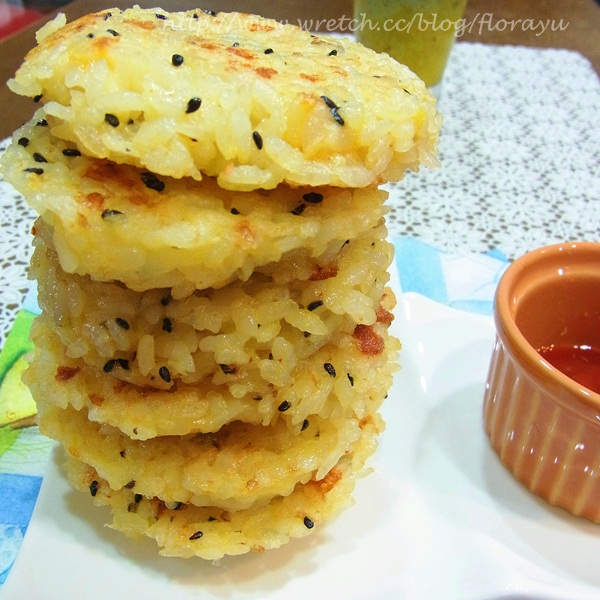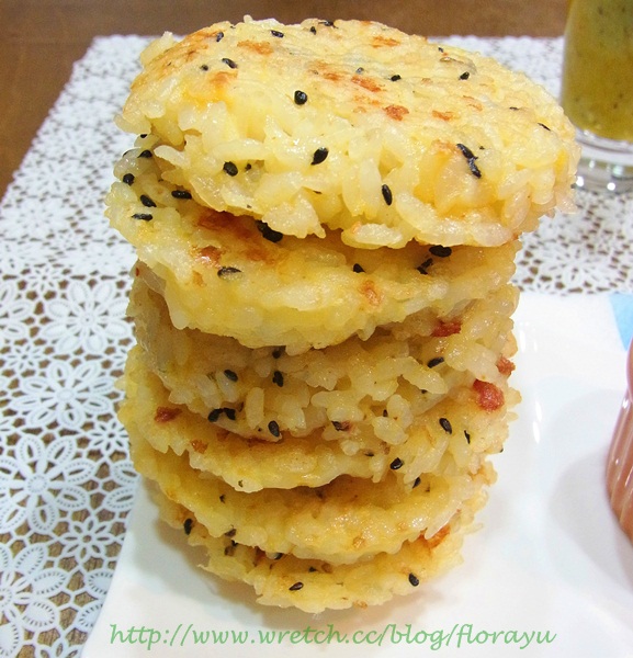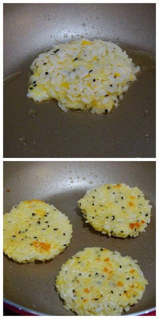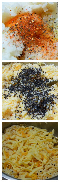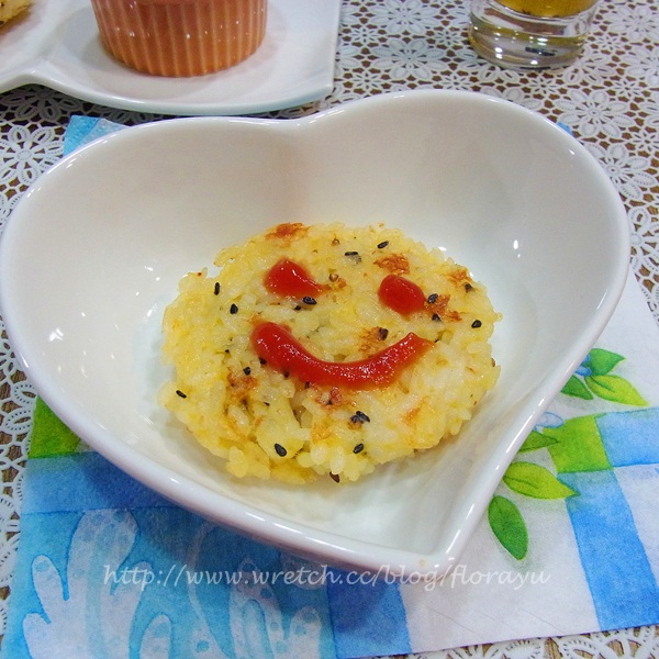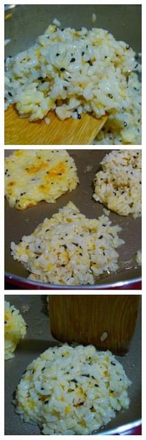 剩飯約三碗(沒完全煎完)+二顆蛋+100克焗烤起司+鹽、七味粉和芝麻調味