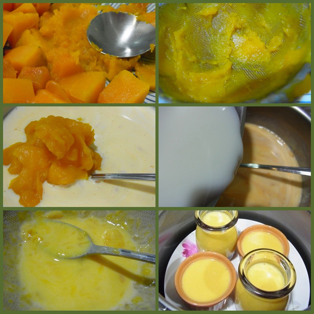 布丁液材料:栗子南瓜170克、牛奶170毫升、鮮奶油70毫升、土雞蛋2顆、糖30克、香草粉1小匙
